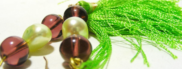 Have some fun with these long tasselled earrings! Gold filled hooks suspend a lime green tassel and pale pistachio colored cultured pearls. Amethyst glass beads provide a contrast. About 3″ long. If you are interested in these please contact me as they are not yet in my Etsy shop