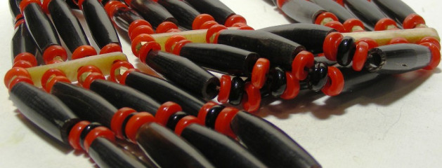 Another Native American inspired choker, this one is made from black hairpipe, red glass, brass, and bone. It, too, is made for a larger neck, and is strung on waxed linen thread. Ties are braided and knotted, instead of the traditional leather thong. If interested, please contact me, as this is not in my Etsy shop. I will be happy as well to make one for you in different colors and lengths.