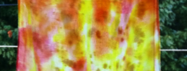 Large and small splotches in varying sizes give this scarf its mottled appearance. The Autumn look is effected by the oranges, salmons, yellows and browns. Light as a feather yet warm as well. At 15″ x 60″, it is long and wide enough for a variety of styles. – $25