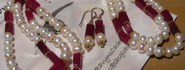 Striking double strand choker, bracelet and earrings made from onyx rectangles, freshwater pearls, garnets and sterling silver. A parure is a set of all three and this set can be purchased in my Etsy...