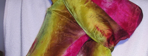 Silk habotai, smooth to the hand and light to the touch. This 8″ x 54″ hand painted scarf will dress up any outfit, especially if said outfit is a solid neutral color. Bold magenta, a muted chestnut brown, and a pretty sunflower yellow combine in a stripey pattern to give this scarf a number of different “looks”, depending on how you choose to tie it....