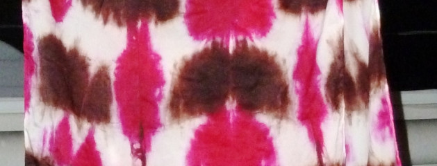 Reminiscent of butterflies, or maybe Rorschach blots, this large charmeuse scarf is painted in magenta and brown large splotches on white. Let your imagination take wing as you tie it in a variety of ways to satisfy your fashion sense. A generous 15″ x 60″...