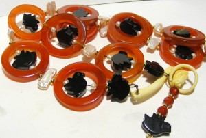 Carnelian open circles enclosing carved onyx birds. Separated by freshwater pearls and attached with a carved bone horse head clasp. SOLD