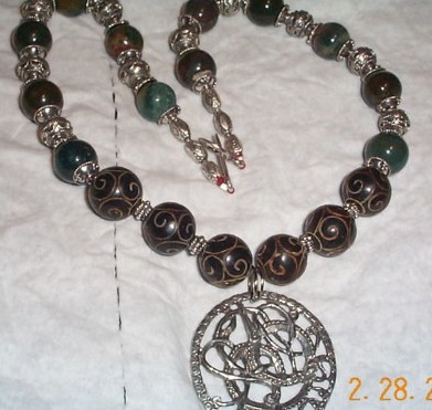 Indian bloodstone capped with Bali silver spacers form the sides of this necklace, framing the carved antique jade and Bali spacers that bracket the sterling silver pendant forged in the shape of Ouroboros. This piece is vintage and strung on waxed linen cord.