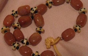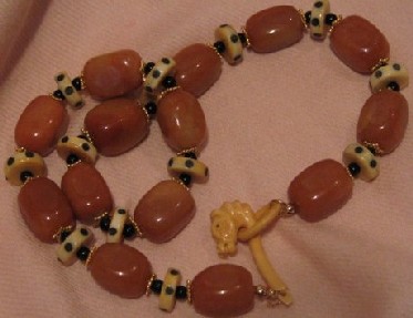 caramel colored aventurine accented with carved and dyed bone and onyx rounds. The carved bone clasp in the shape of a horse’s head can be worn in the back, as usual, or in the front as a focal piece. — SOLD