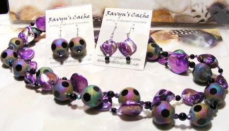 This two strand necklace is approximately 20″ long, and comes with two pairs of earrings, both of which match the necklace, but have a totally different look. Made with black onyx, mother of pearl chips, Swarovsky crystals and coated and carved glass. Both clasp and earring hooks are Sterling silver. This set was donated to a Whitfield School Montage auction a while back. If you ever have a chance to attend one of these fundraisers for a terriffic school, you won’t be disappointed. It’s quite fun!
