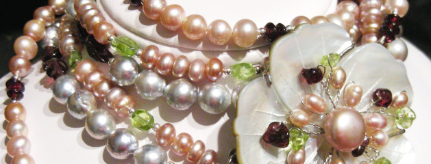 This triple strand necklace is approximately 18″ long, with a gorgeous clasp made from mother of pearl and adorned with pearls, garnets and peridots. The same combination was carried on into the necklace itself.