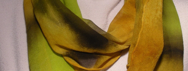 Silk Chiffon 13×54 Scarf Posted by admin on Jan 26, 2013 in Scarves | Offset blocks of bright chartreuse are the focals of this floaty chiffon scarf. Brown and goldenrod tones accent the edges for 13″ x 54″ of airy silk luxury. $20