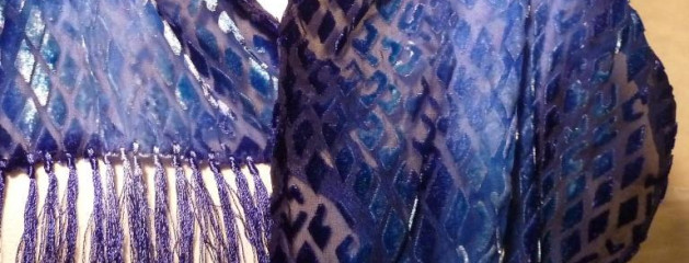 Look closely and you can tell that this gorgeous blue scarf is actually painted in various shades and saturations of blue. The rayon velvet diamon pattern is woven on to a silk backing, making a soft and snuggly scarf to decorate your ensemble. Fringe completes the fancy image.