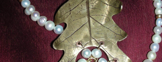 Brass and pearl oak leaf necklace Posted by admin on Sep 29, 2012 in Featured, Jewelry, Necklaces | Hand formed brass oak leaf with pearls – not for sale